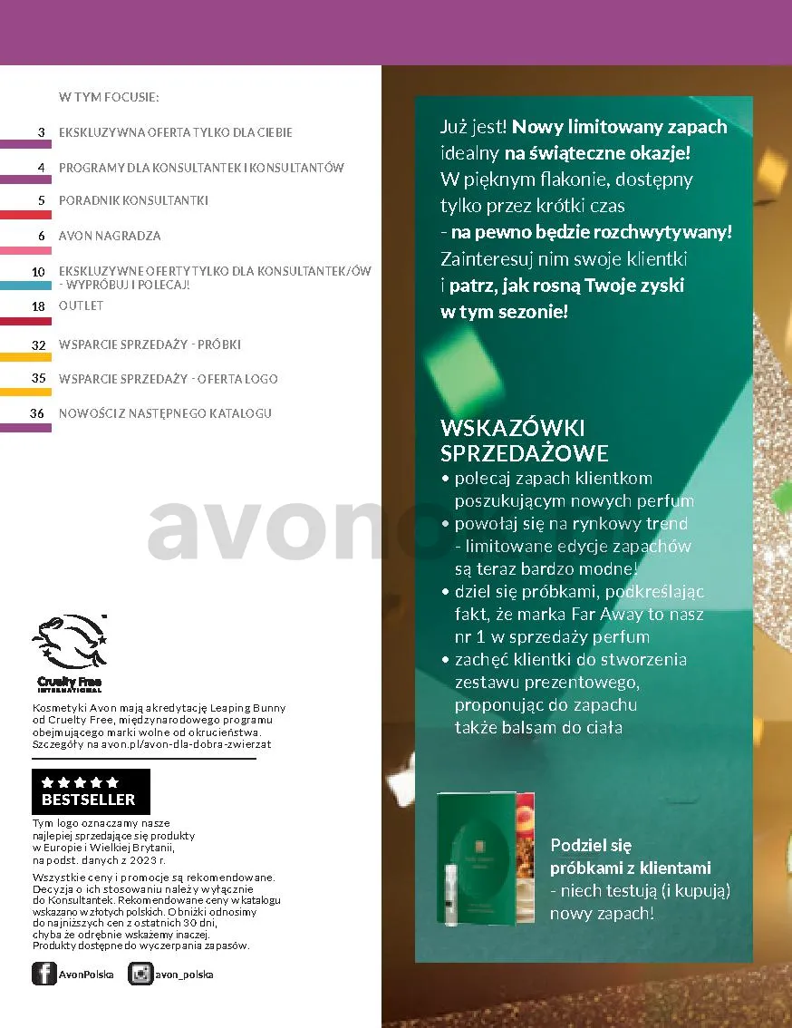 Avon Fokus 11/2025 Listopad to świąteczne wydanie pełne inspiracji, elegancji i korzyści. Limitowany zapach Far Away Sparkle, atrakcyjne rabaty, porady ekspertów i ekskluzywne zestawy prezentowe sprawiają, że to numer obowiązkowy dla każdej konsultantki.