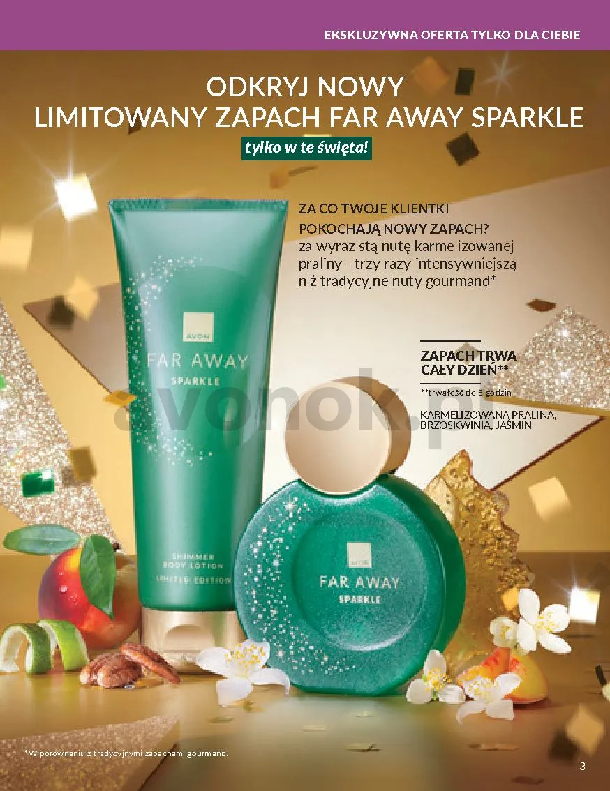 Największa premiera Avon Fokus 11 2025 to Far Away Sparkle – edycja limitowana kultowego zapachu, dostępna tylko w okresie świątecznym.