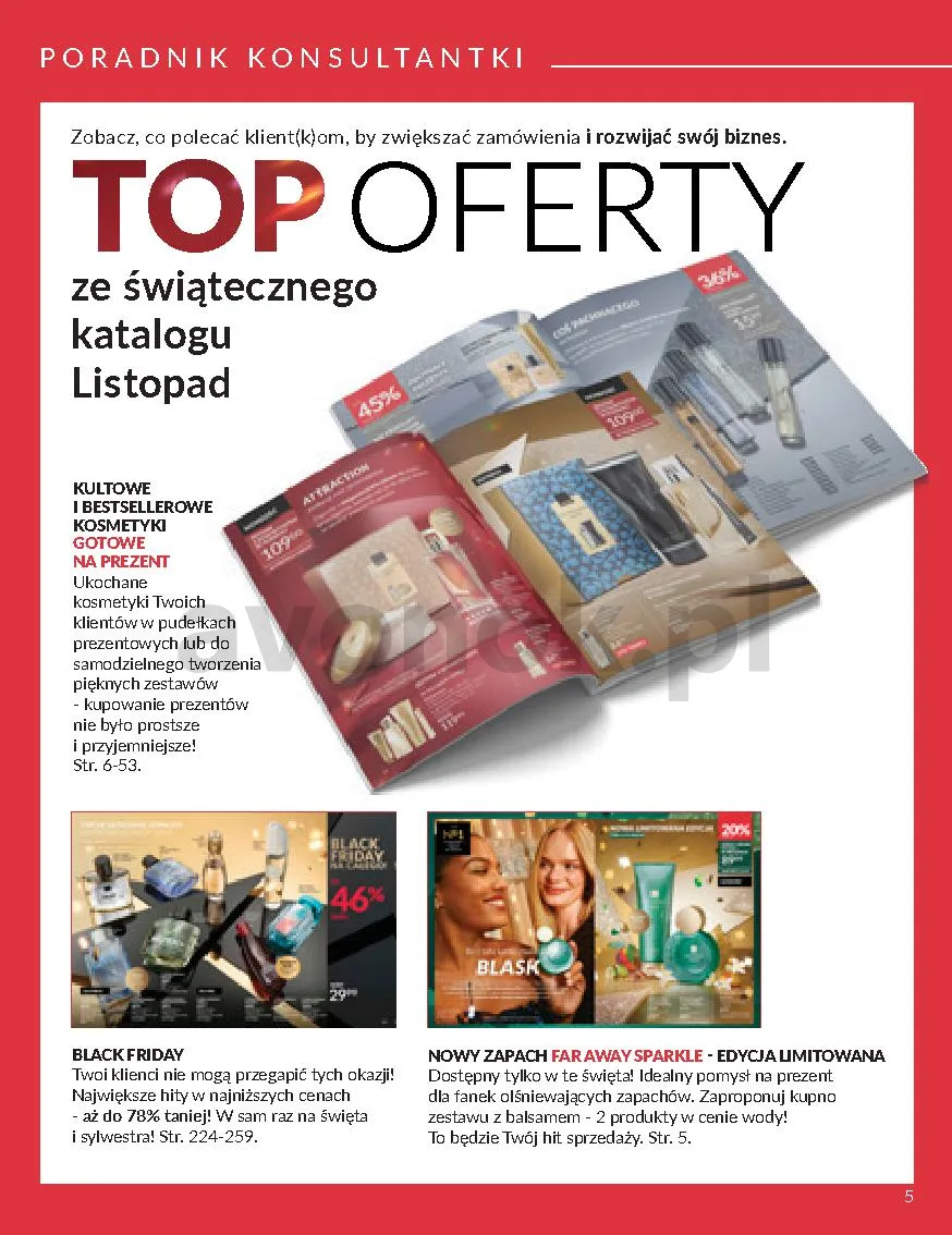 Listopadowe wydanie Avon Fokus 11/2025 Listopad to zapowiedź najbardziej magicznego czasu w roku – pełnego blasku, prezentów i wyjątkowych emocji. Katalog koncentruje się na świątecznych nowościach, promocjach dla konsultantek oraz inspiracjach, które pomogą zwiększyć sprzedaż przed Bożym Narodzeniem. Hasłem przewodnim tego numeru jest “Podkręć swoje zyski z nowym zapachem Far Away Sparkle!”, a całe wydanie błyszczy w złoto-zielonej oprawie i pachnie słodkimi pralinkami oraz jaśminem.