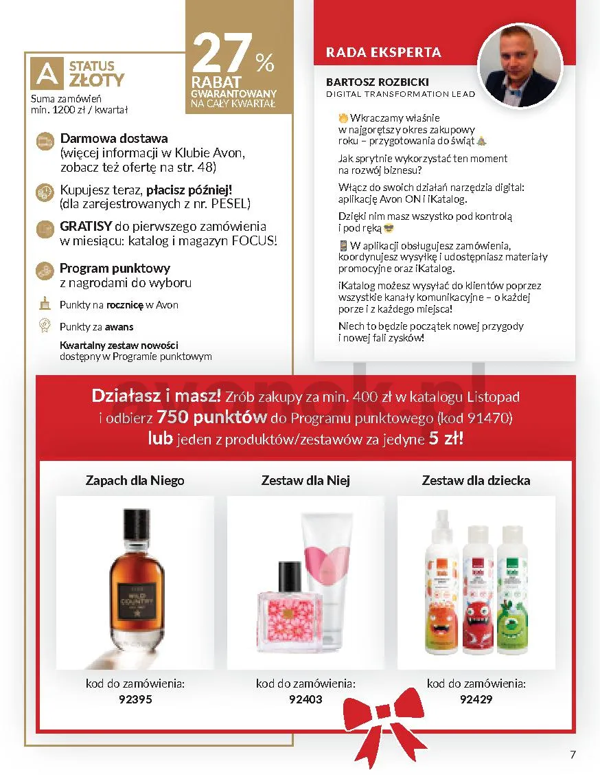 Dodatkowo, przy zamówieniach za minimum 400 zł w katalogu Listopad, można odebrać 750 punktów lub zestaw produktów za 5 zł (dla Niej, dla Niego lub dla dziecka).